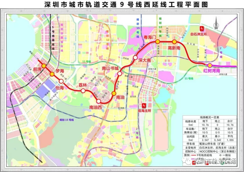 地鐵9號線西延線深入南山中心區和前海自貿區,西起前灣站(與5號線南延線換乘),東至紅樹灣南站,全長約10.8公里,共設10座車站,其中5座換乘站。