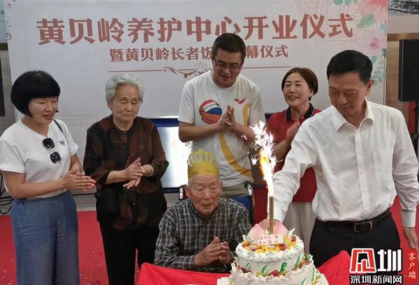 當天下午,在歡樂喜慶的背景音樂中,羅湖區政協主席吳裕中、副主席羅安娜,羅湖區衛生健康局局長鄭理光,羅湖區民政局局長楊文秀,羅湖醫院集團院長孫喜琢,黃貝嶺靖軒股份公司董事長張偉明一起為黃貝嶺養護中心及黃貝嶺長者飯堂揭牌。之后,有著63年黨齡的86歲老人惠發安坐著輪椅,和62年黨齡的83歲老伴張歧蘭一起,伴著推來的生日蛋糕來到揭牌現場,當天正是惠發安86歲大壽生日,參加開業儀式的羅湖區政協委員、羅湖區衛健局負責人等和現場人員一起,一邊鼓掌一邊唱起生日歌,為老人溫馨慶生。