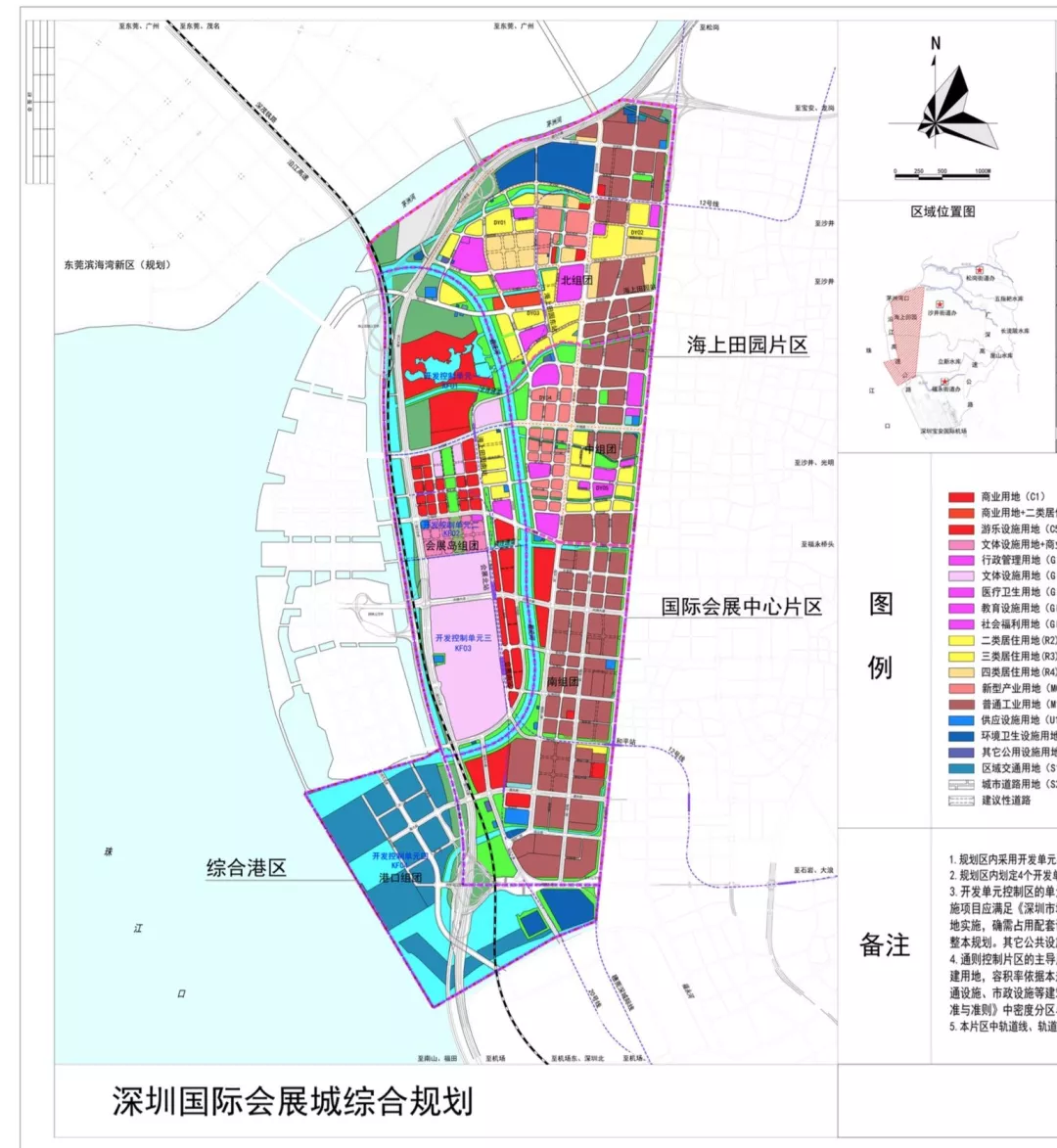 “深圳國際會展城”范圍北抵茅洲河、東至松福大道、南臨福永河、西側主要以廣深沿江高速公路為界,并包括規劃寶安綜合港區,范圍共計22.57平方公里,規劃區劃分為三個片區:國際會展中心片區、海上田園片區和寶安綜合港區。