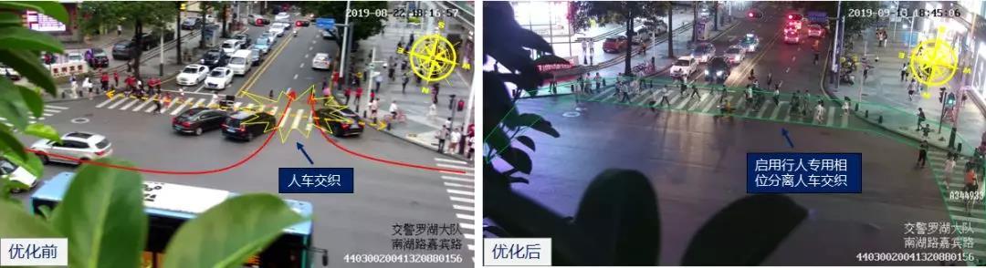 針對現狀問題,深圳交警采用單周雙次的信控策略,小批量、多頻次地放行嘉賓路方向車輛,緩解因公交車隊列化導致路口交通鎖死的問題;同時,采用行人專用相位集中放行行人,保障行人過街安全。路口優化后,路口“回堵”現象顯著減少,行人過街安全性提高,路口高峰小時通過量從2130pcu/h增至2285pcu/h,上升7.28%。