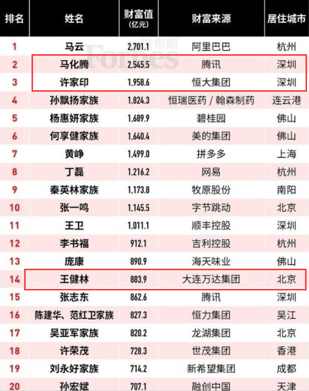 福布斯發布2019中國富豪榜,馬云馬化騰許家印前三,王健林從去年的第4位跌至第14位
