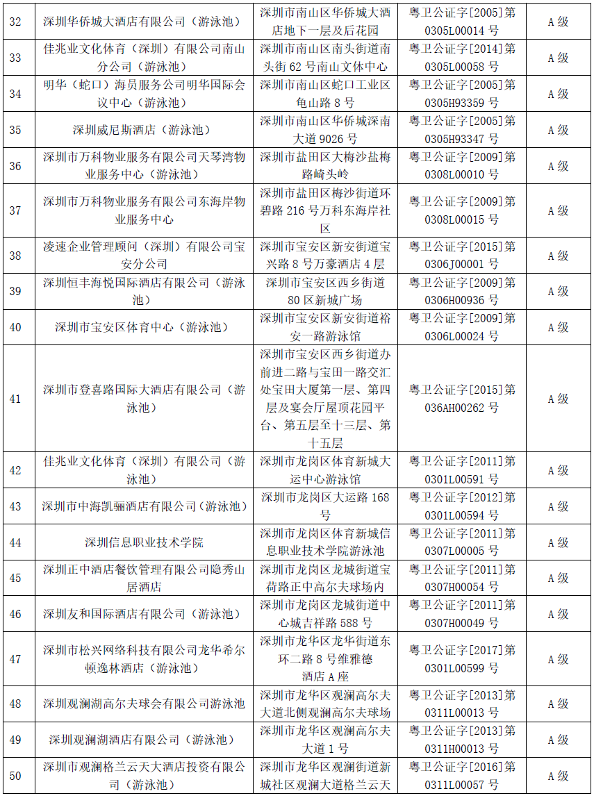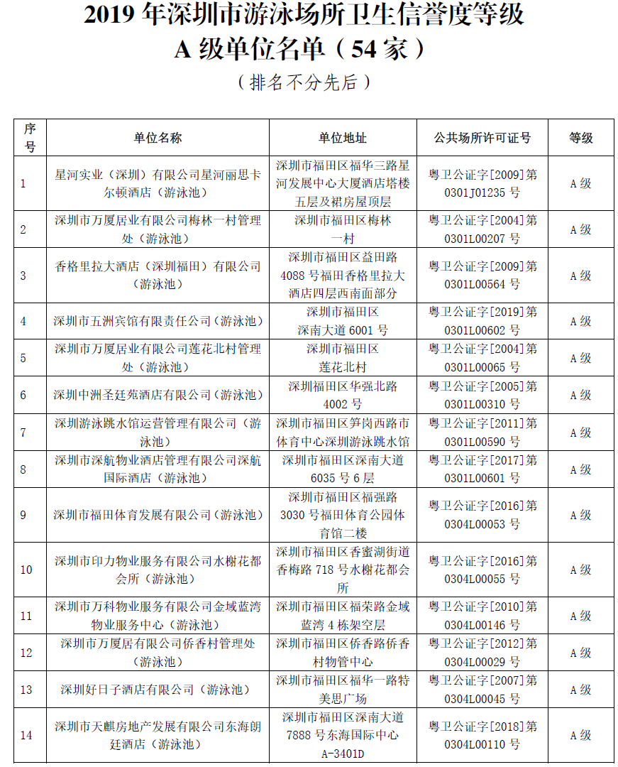 附:2019年深圳市游泳場所衛生信譽度等級A級名單