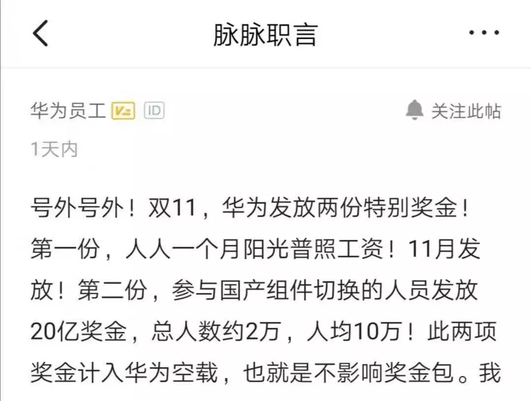 還有網友表示,“20億是只獎勵大概兩萬人,針對的是把美國零部件替換成華為自己零部件的研發崗位人員,其他所有華為正式員工,包括上面的兩萬多人,獎勵一個月工資,工資參考的10月份的工資,年終獎不受影響?!?/p>