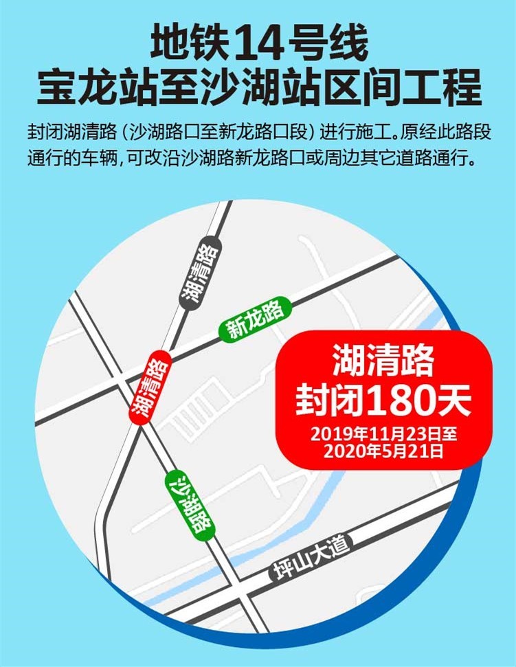 2019年11月23日至2020年5月21日共180天,封閉湖清路(沙湖路口至新龍路口段)進行施工。原經此路段通行的車輛,可改沿沙湖路新龍路口或周邊其它道路通行。