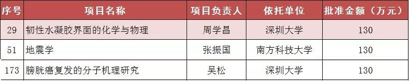 深圳大學2個,分別是:韌性水凝膠界面的化學與物理(項目負責人:周學昌);膀胱癌復發的分子機理研究(項目負責人:吳松);