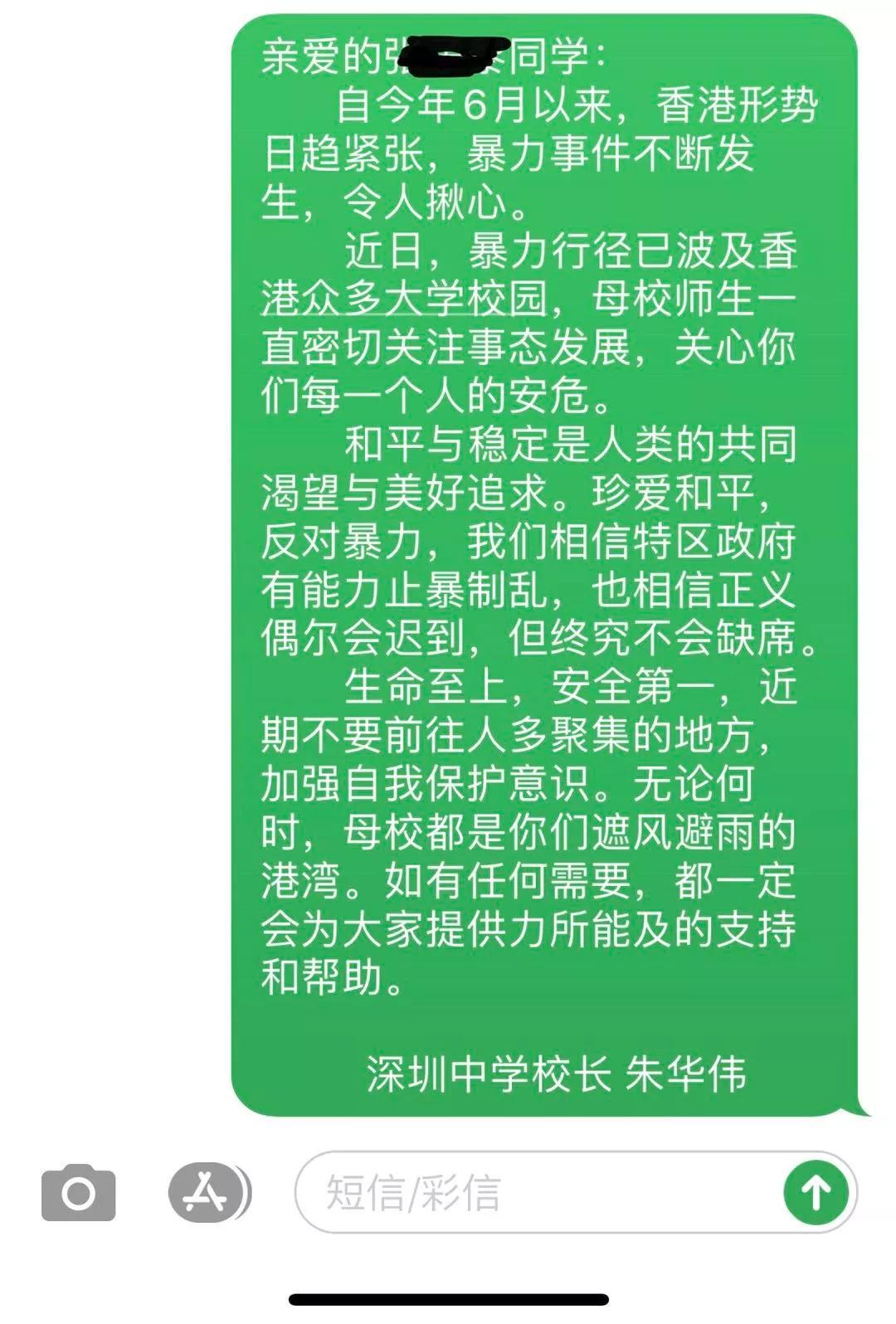 此外,深圳中學校長朱華偉還向在港的深中學子發送了問候短信,希望他們多注意自身安全,“無論如何,母校都是你們遮風避雨的港灣”,讓收到短信的學子倍感溫暖。