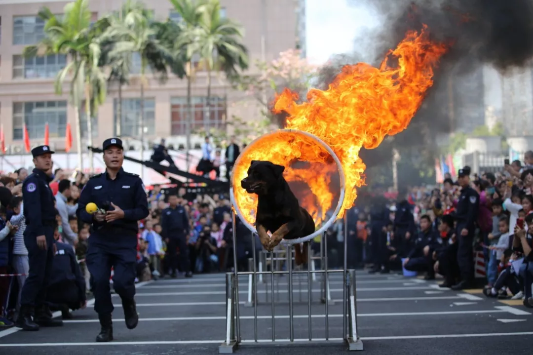 實(shí)戰(zhàn)撲咬、解救人質(zhì)、跳火圈……警犬強(qiáng)悍威猛、敏銳靈動(dòng),成為了比武展示活動(dòng)上的焦點(diǎn)。拳術(shù)表演動(dòng)作利落瀟灑,孔武有力,展現(xiàn)著福田警察的精神風(fēng)貌,市民朋友贊嘆不已。