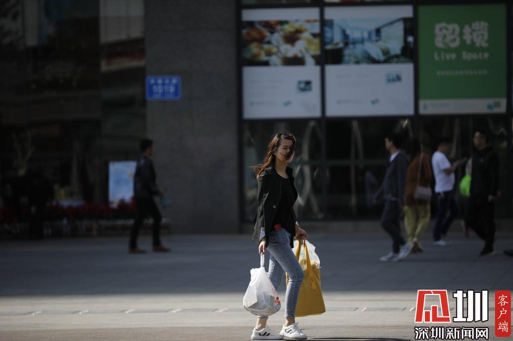 華強北商圈,大風吹亂了一位出行女士的頭發。