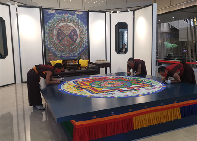 在活動現場,壇城沙畫的現場制作格外引人注目。“一沙一世界,一葉一菩提”——壇城沙畫的過程仿佛一場視覺的盛宴。據了解,壇城是指對一座宮殿一個世界的泛義,用珍貴珊瑚、瑪瑙、綠松石等礦物質研磨成粉,落沙即成畫,畫面立體生動,壇城展示了高度的藝術魅力和視覺觀感。