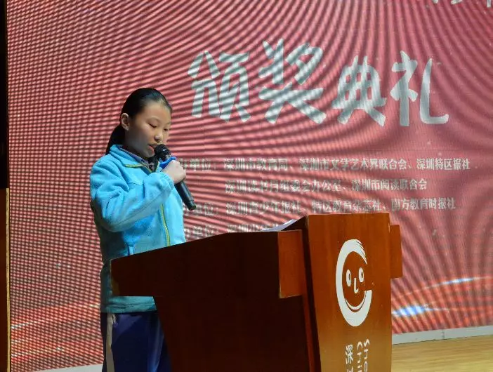 頒獎(jiǎng)會(huì)由深圳教育報(bào)刊總社總經(jīng)理鄧衛(wèi)主持。深圳市教育局副局長(zhǎng)王水發(fā)、深圳報(bào)業(yè)集團(tuán)副總編輯呂延濤、深圳市文聯(lián)副主席張忠亮、深圳市教育局德體衛(wèi)藝處處長(zhǎng)馮妍妍、深圳讀書(shū)月組委會(huì)辦公室主任助理、深圳出版集團(tuán)綜合事業(yè)部部長(zhǎng)朱德明、深圳教育報(bào)刊總社總編輯李青松和深圳市閱讀聯(lián)合會(huì)專職副秘書(shū)長(zhǎng)于芃等領(lǐng)導(dǎo)分別為獲獎(jiǎng)學(xué)生、老師和學(xué)校代表頒獎(jiǎng)。