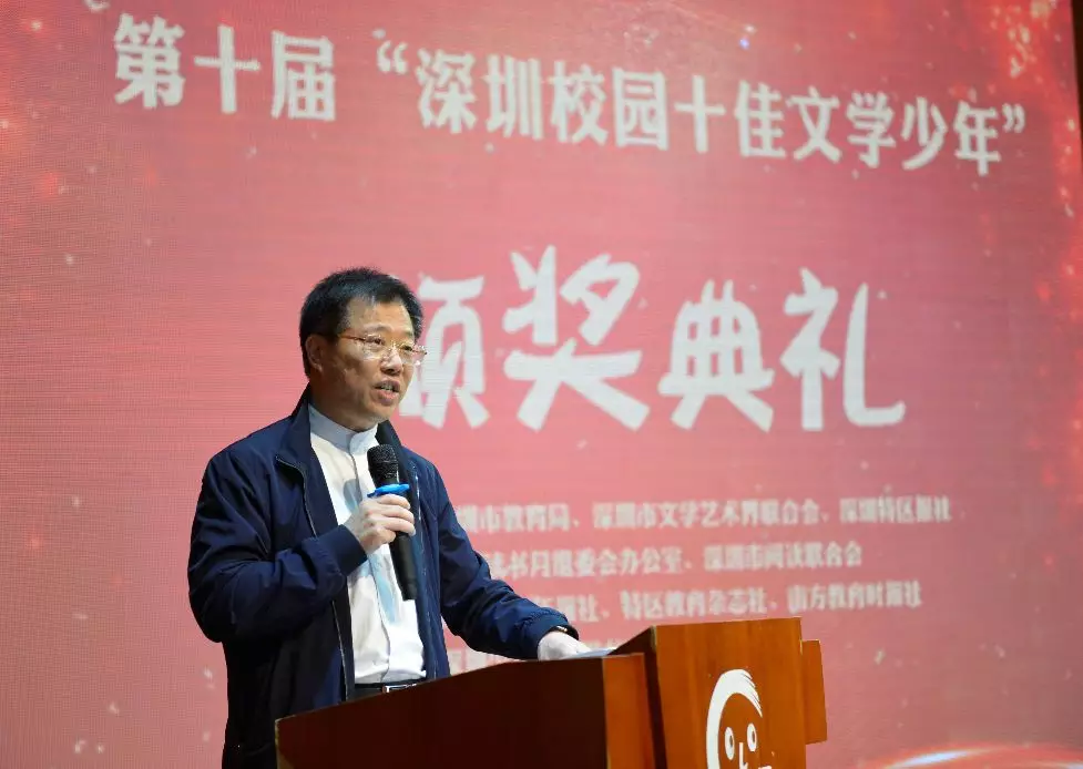 市教育局副局長(zhǎng)王水發(fā)代表深圳市教育局向獲獎(jiǎng)的同學(xué)表示熱烈祝賀。他說(shuō),為了培育社會(huì)核心價(jià)值、傳承民族文化基因、培養(yǎng)文化創(chuàng)意人才,深圳校園文學(xué)開(kāi)辟了一條新的路徑,對(duì)深圳建設(shè)城市文明典范起到了奠基、培根和固本的重要作用。