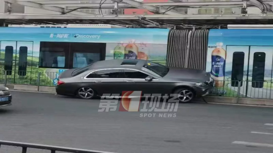 《第一現場》記者立即趕到事發地點,看到有軌電車旁邊的2扇護欄被小車撞掉了,事發現場用警戒線圍著。監控畫面顯示,今天下午16點48分,一輛黑色奔馳轎車在行駛過程中,突然騎上道路左邊的路沿石,撞倒了護欄之后,再撞到有軌電車。