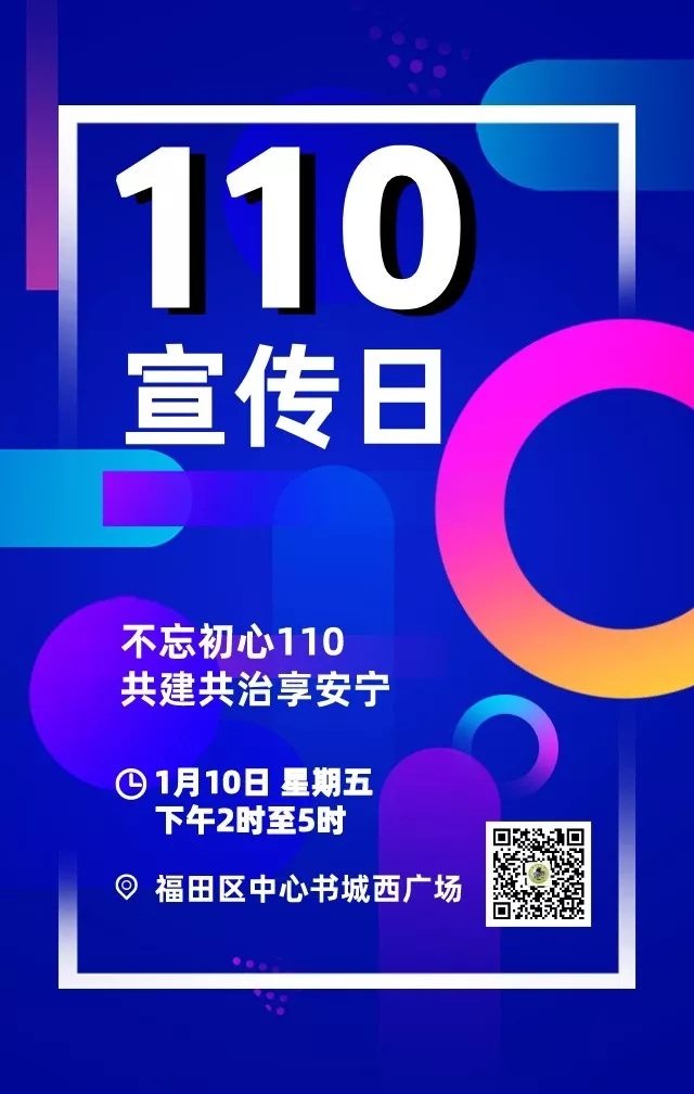 “110宣傳日”來啦!1月10日下午2時至5時,福田區中心書城西廣場將作為“110宣傳日”主會場,本次活動主題是“不忘初心110,共建共治享安寧”。
