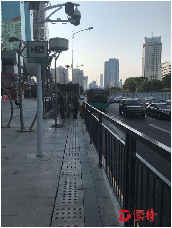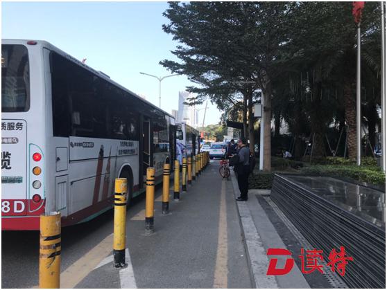▲1月14日下午,記者拍攝的深南大道南側崗廈北地鐵站②公交站,被隔離樁隔離處的人行道非常狹窄,給行人、自行車和上下公交車的乘客都帶來不便。