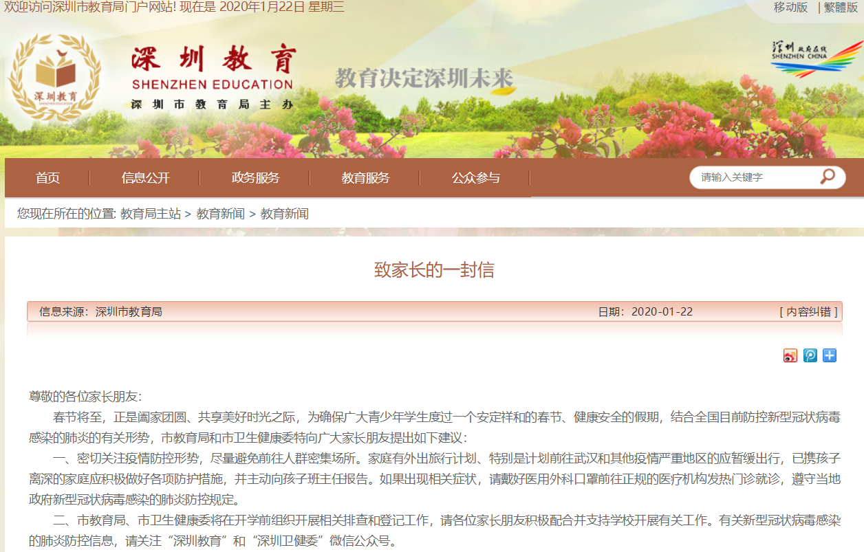 此外,市教育局和市委建委聯合致信家長,建議家長朋友密切關注疫情防控形勢,盡量避免前往人群密集場所,計劃前往武漢和其他疫情嚴重地區的應暫緩出行。已攜孩子離深的家庭應積極做好各項防護措施,并主動向孩子班主任報告。如果出現相關癥狀,請戴好醫用外科口罩前往正規的醫療機構發熱門診就診,遵守當地政府新型冠狀病毒感染的肺炎防控規定。市教育局和市衛生健康委將在開學前組織開展相關排查和登記工作。