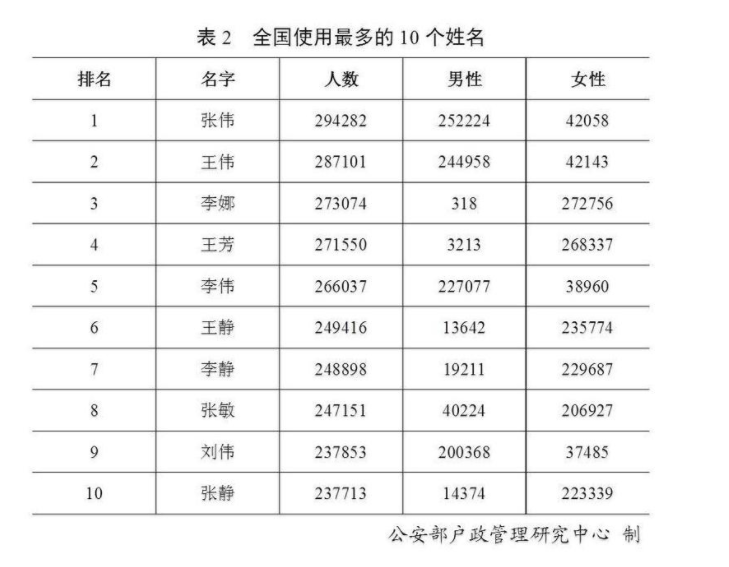 全國戶籍人口中,有30萬個“張偉”、27萬個“李娜”…