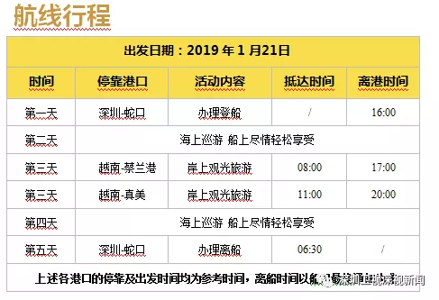 據悉,歌詩達威尼斯號郵輪1月21日16時從蛇口郵輪母港出發,為6天5晚的航程,航行路線為:深圳-下龍灣(蔡蘭港)-峴港(真美)-深圳。