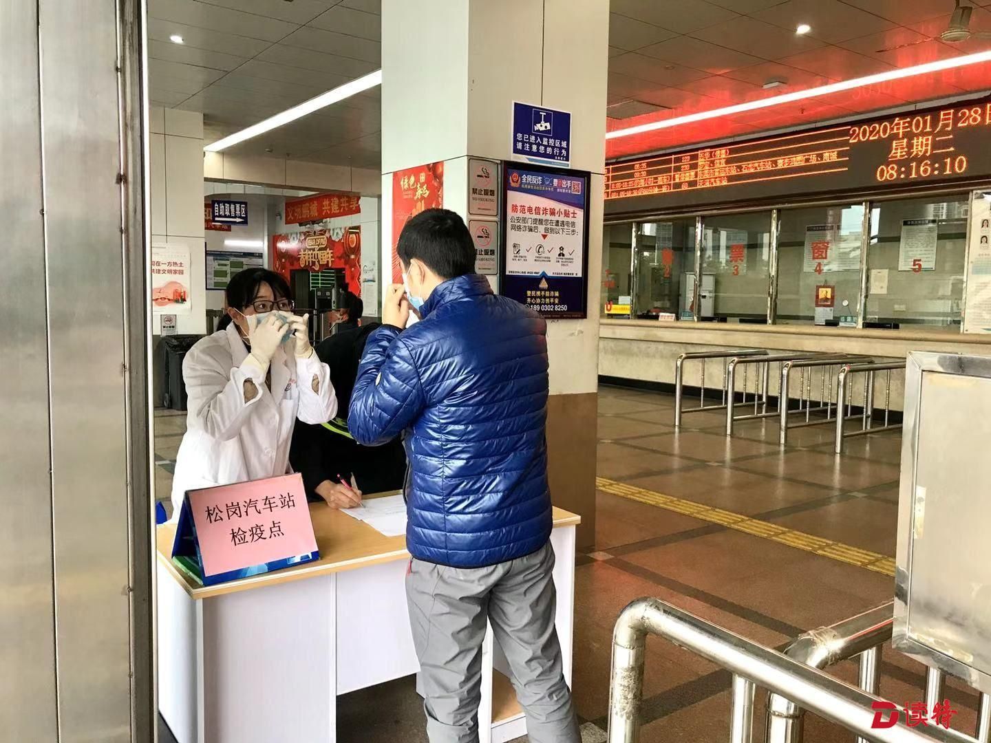醫護人員在松崗汽車站檢疫點教市民正確佩戴口罩
