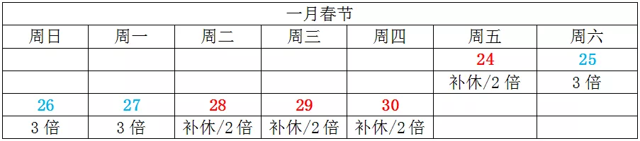 1月25日、26日、27日屬于法定節假日,應支付三倍工資。1月24日、28日、29日、30日屬于休息日,如果公司不安排補休,則應支付二倍工資。