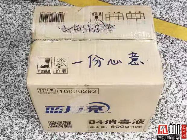 2020年1月30日晚20:55分,深圳地鐵梅村站工作人員正在安檢口執勤時,一名戴著口罩的男子走進來,放下一個箱子便轉身離去。工作人員發現箱子上寫著“一份心意”四個字,打開發現箱內有12瓶84消毒液,正欲上前感謝時,男子已匆匆離開,只留下了一個背影。