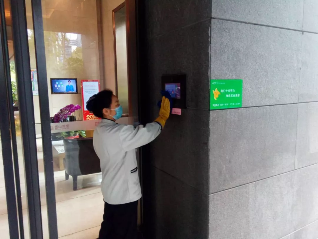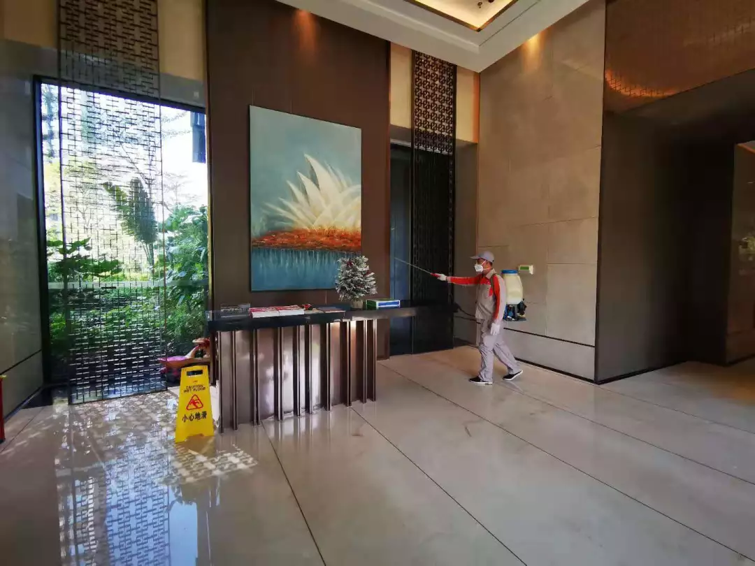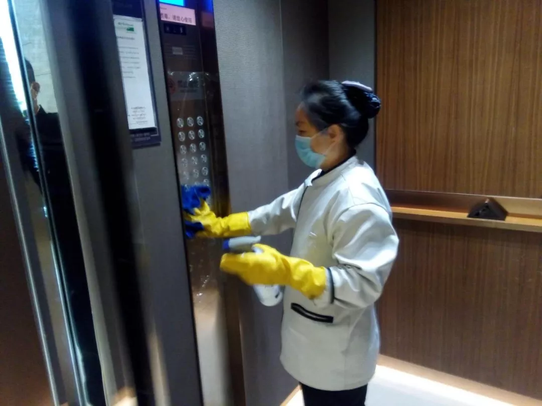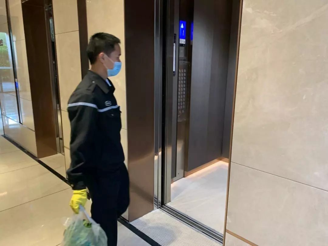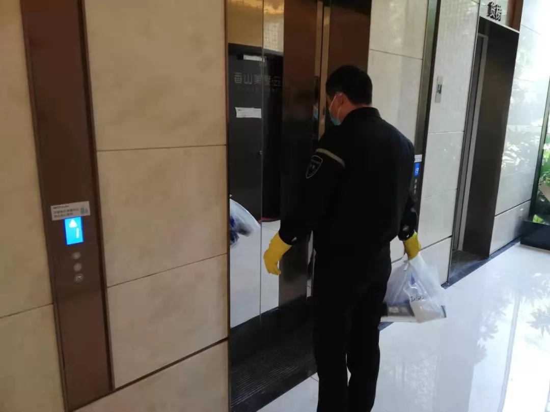 每天對小區公共區域大堂門把手、門禁對講機、電梯按鍵、大堂茶幾沙發等高頻接觸區進行消毒及對轎廂按鈕定時更換保鮮貼膜。