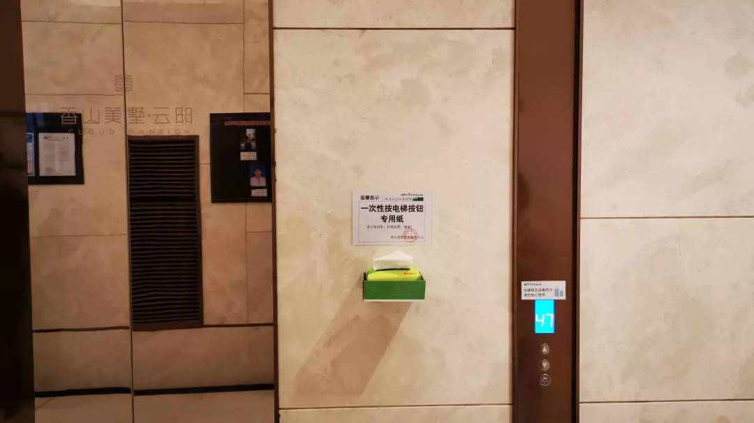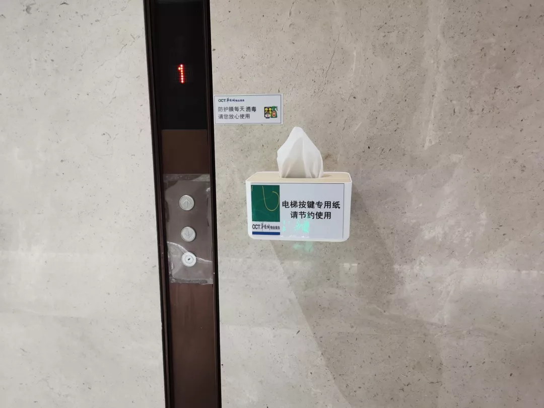 考慮到防控形勢需要,中心對電梯間及按鈕每天至少不低于2次消毒、且每天更換保鮮貼膜外,又于31日在各個電梯廳增設了一次性抽紙,供乘坐電梯按電梯按鈕時取用。(注:部分樓棟、明天陸續增設到位)