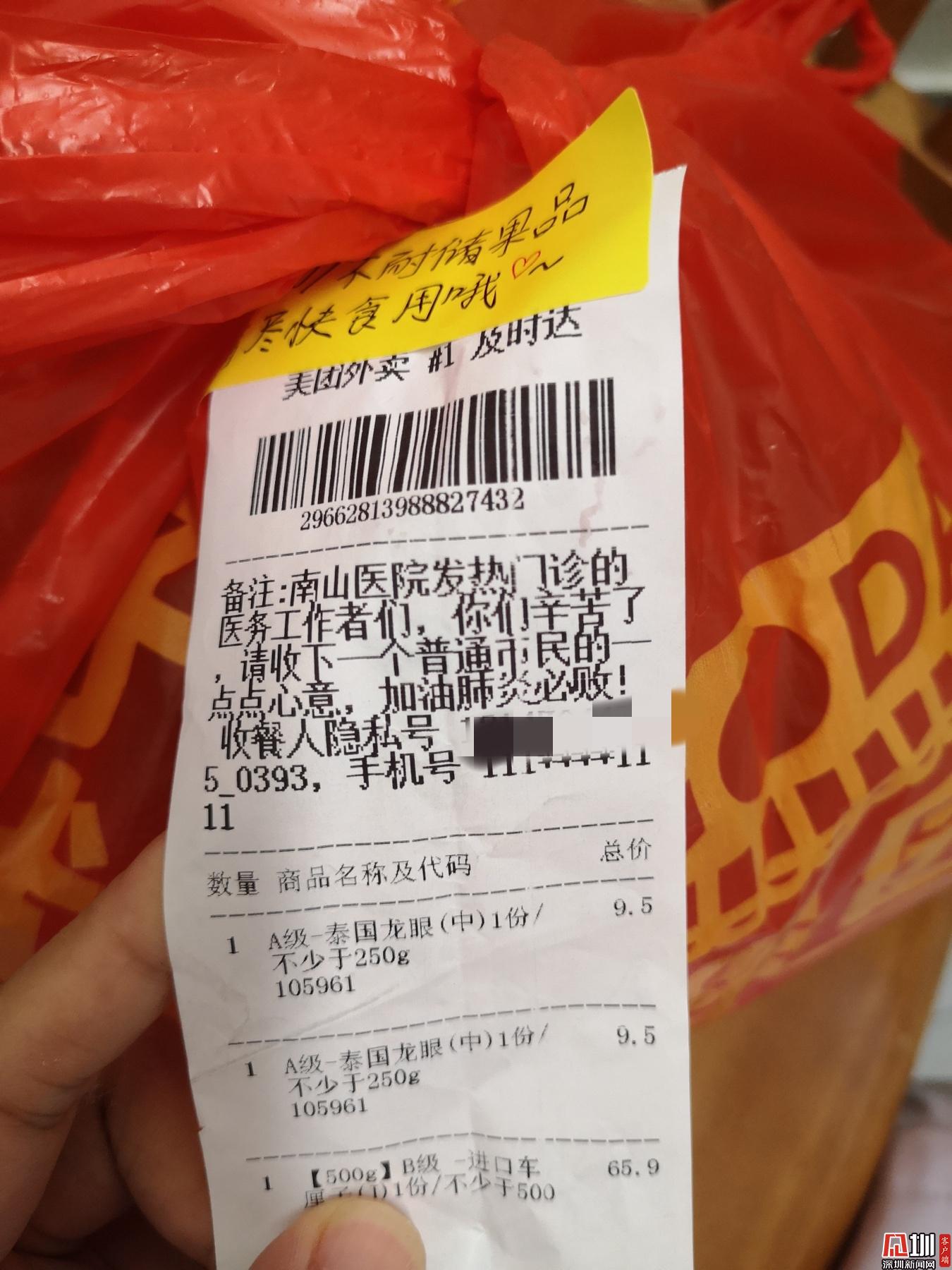 見圳客戶端·深圳新聞網(wǎng)2020年2月1日訊 (見圳客戶端、深圳新聞網(wǎng)記者 劉夢婷 通訊員 深協(xié)和)“老淚縱橫!”1月30日晚上8點56分,華中科技大學協(xié)和深圳醫(yī)院(南山醫(yī)院)手外科護士王敏在朋友圈曬了一張照片,瞬時網(wǎng)友們紛紛點贊。照片里是一個紅色塑料袋上貼著一張外賣單,備注上寫著,“南山醫(yī)院發(fā)熱門診的醫(yī)務(wù)工作者們,你們辛苦了!請收下一個普通市民的一點點心意,加油,肺炎必??!”