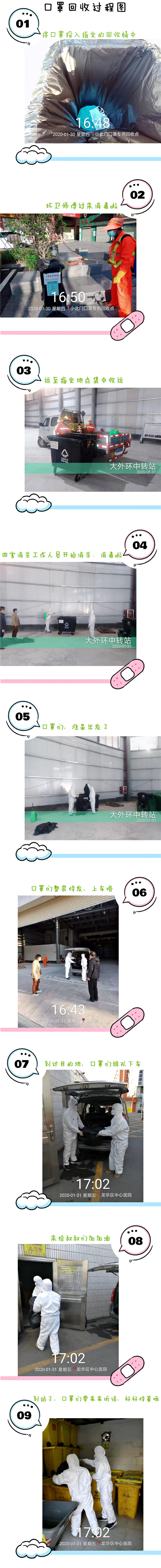 據了解,廢棄口罩每天由環衛服務公司定時收集運送至街道回收站,再由消殺公司工作人員著防護服現場消毒后統一運送到龍華區中心醫院進行統一專業化銷毀處理(詳細流程見下圖)。整個處理流程福城街道市政管理服務中心嚴格把控,每天安排專人進行現場督促處理,堅決防止廢棄口罩因處理不當引起的二次污染。