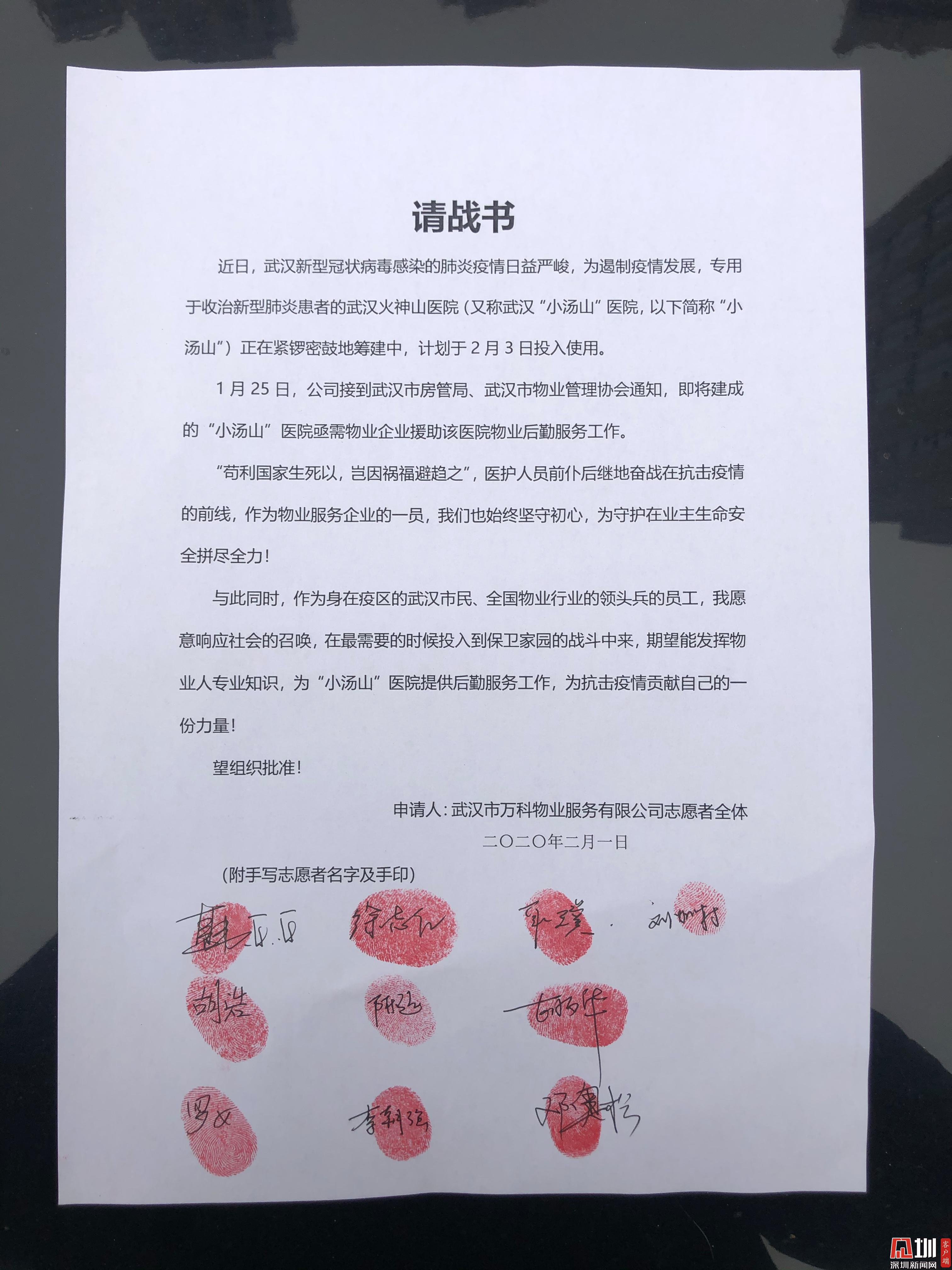 此次志愿者報(bào)名得到了大家的積極響應(yīng)。1月25日,武漢萬科物業(yè)接到武漢市物業(yè)管理協(xié)會的通知,希望萬科物業(yè)征集20名志愿者支援武漢火神山醫(yī)院。當(dāng)晚倡議書發(fā)出后,已有11人報(bào)名,到26日下午3時(shí),報(bào)名人數(shù)增加到40人。這40位自愿報(bào)名者涵蓋了物業(yè)各個(gè)崗位,既有一線員工,也有物業(yè)管理人員。