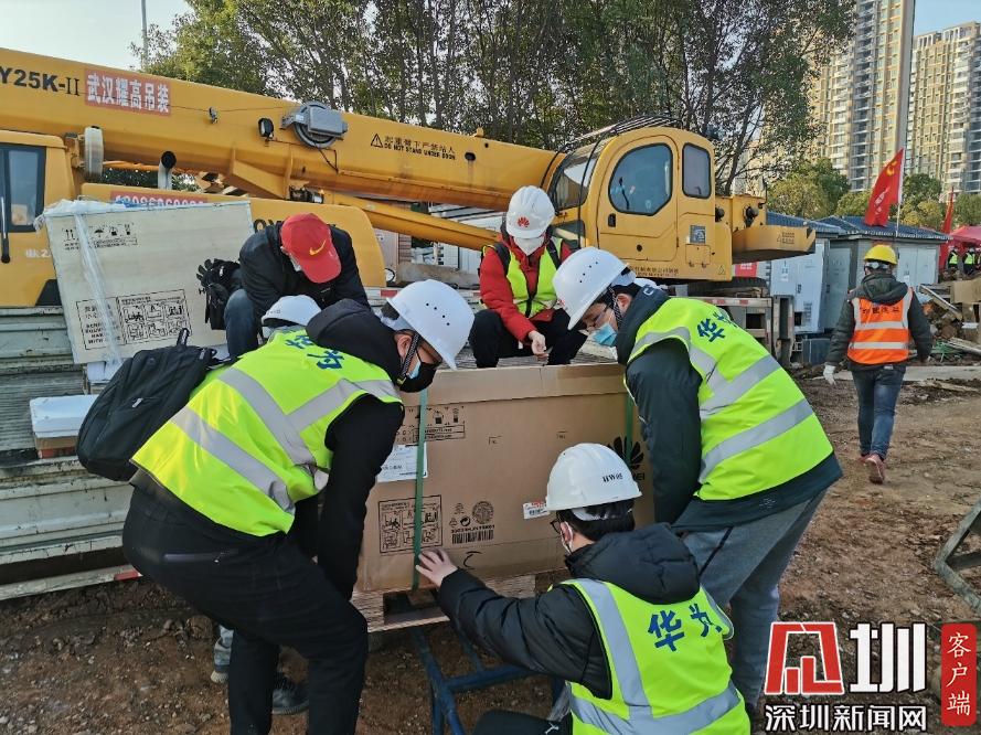 1月31日下午,華為網絡、視頻會議等設備緊急運輸進場,準備施工調測 。 (華為供圖)