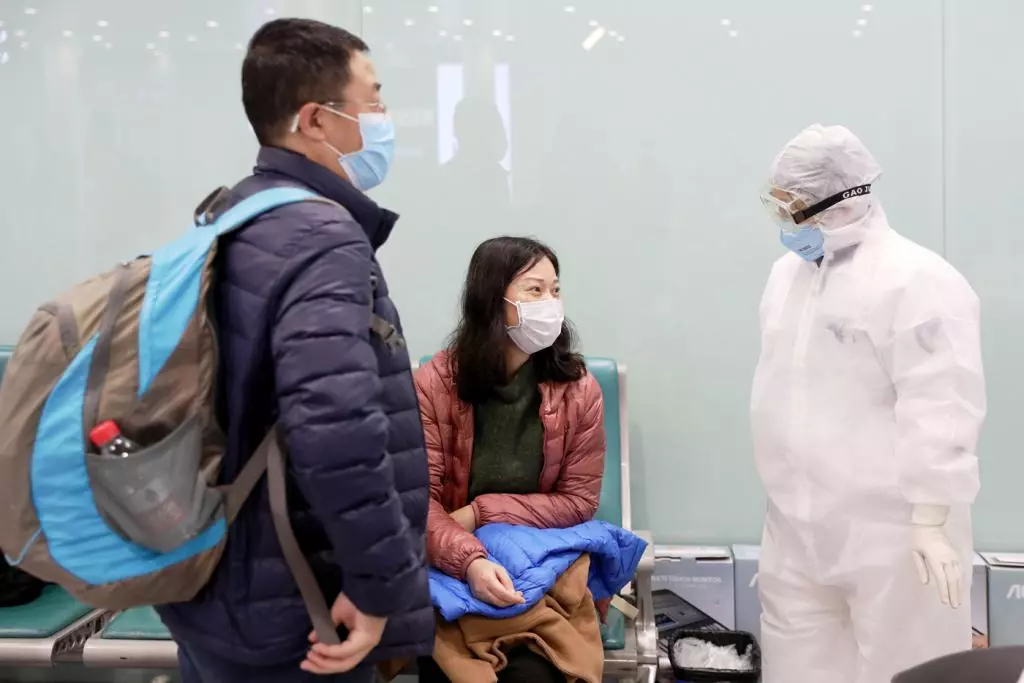 在機場檢疫站旁,醫務人員對旅客進行詢問和醫學健康篩查。