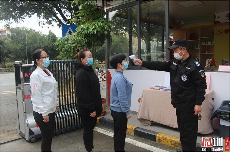 上午8點30分,海樂社區黨群服務中心社區工作站的保安正為義工測量體溫。