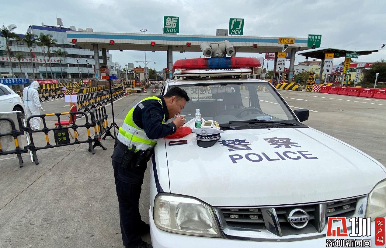 蘇廷源在鲘門高速口防疫檢查站執勤,對進入深汕合作區的車輛及人員進行逐一排查。排查途中,蘇廷源抽空在警車旁迅速解決了自己的午餐。(見圳客戶端、深圳新聞網記者羅瑜)