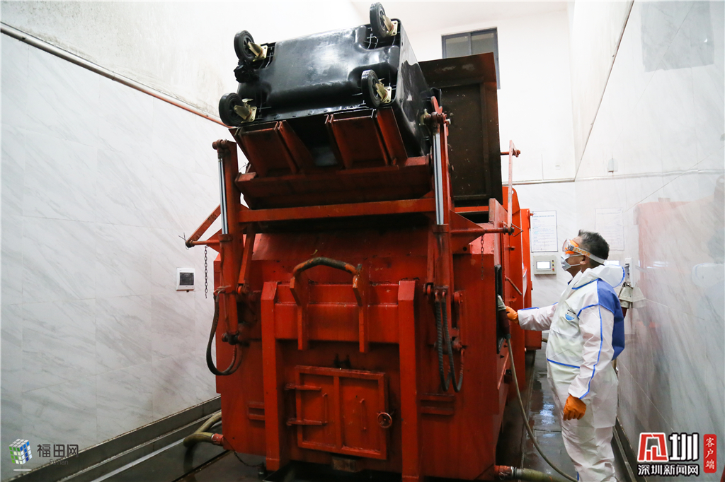 現代化城市生活固然便捷,但是也制造巨量的生活垃圾。垃圾清運人員凌晨3點半起床后開始準備一天的工作。這段時間,轉運站配置1:250的高濃度消毒液,一桶消毒液夠用一個垃圾轉運站。記者看到,電動垃圾轉運車上的四個環衛消殺工作人員穿著厚厚的白藍色隔離服,全副武裝迎接來自轄區源源不斷運過來的垃圾桶,隨著垃圾轉運車后滋滋作響的電流聲,車后的平板放下來了,一桶桶垃圾平穩有序的拽拉進垃圾轉運站進行壓縮,因工作服的關系,工作人員眼罩上經常被一層厚厚的水霧糊上,工作期間會把手套摘除后,從手心處甩出一把把汗。