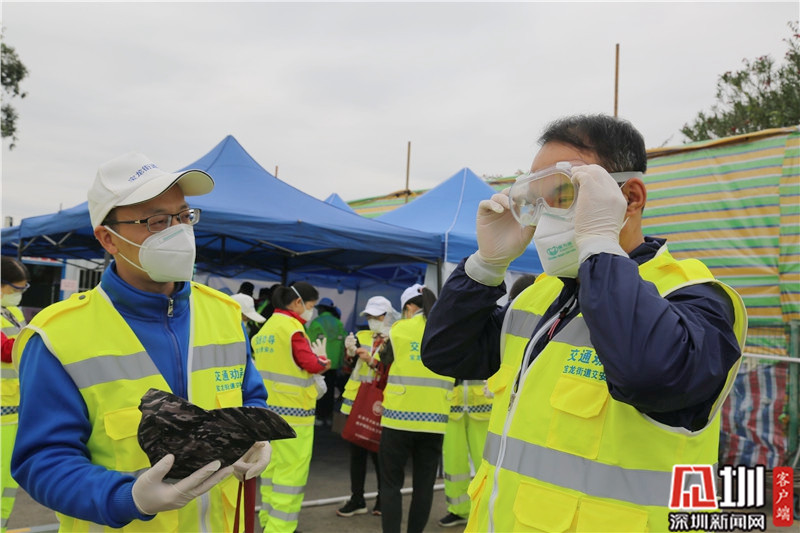 “全副武裝”后,龍崗區文化廣電旅游體育局局長劉德平(右)準備上一線。