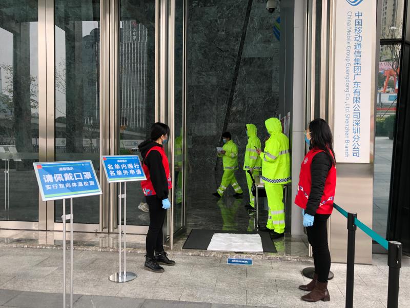 中國移動門口實行雙向體溫監測,名單內通行,名單外申請。