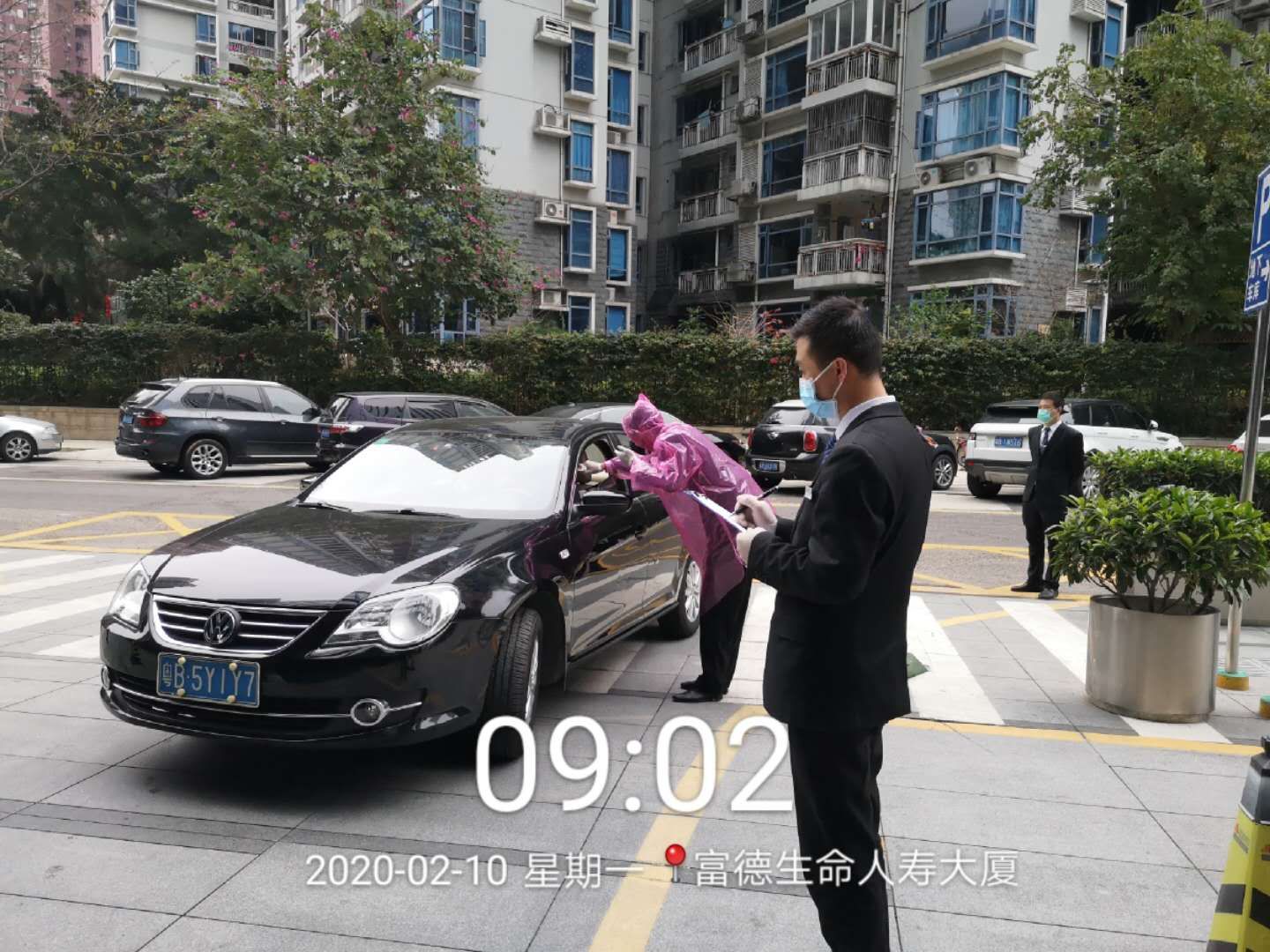 蓮花街道富德生命人壽大廈對進入園區車輛駕駛員及乘客進行體溫監測及信息登記