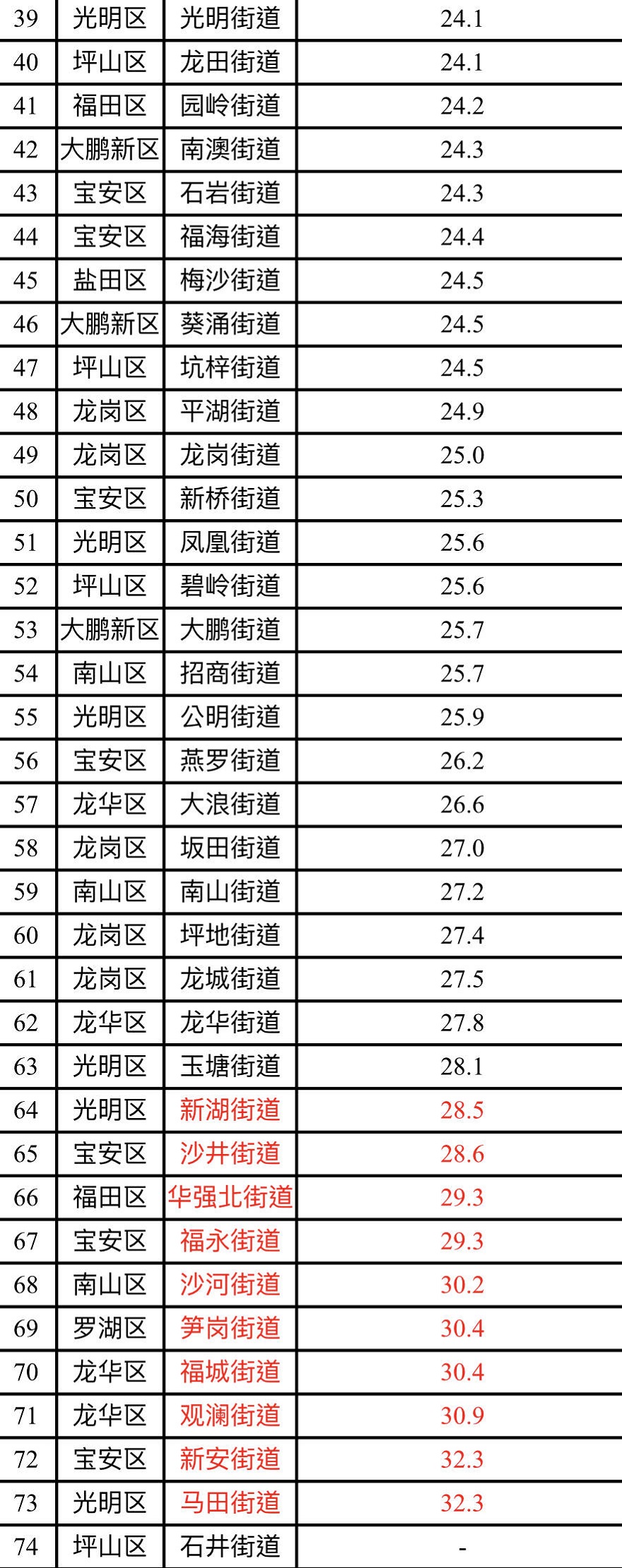 見圳客戶端·深圳新聞網2020年2月12日訊(見圳客戶端、深圳新聞網記者 陳婕)2020年1月,深圳市74個街道PM2.5濃度在18.4-32.3微克/立方米之間,均值為24.3微克/立方米。排名前十的是:橫崗、黃貝、鹽田、海山、桃源、梅林、南湖、福田、東門和翠竹等街道,排名倒數前十的是:馬田、新安、觀瀾、福城、筍崗、沙河、福永、華強北、沙井和新湖等街道。
