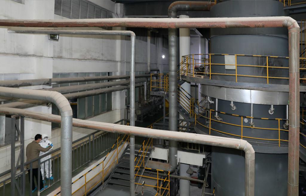 焚燒車間內,矗立著兩座高達十余米的熱解焚燒爐。焚燒爐中的溫度高達1000°C以上,正在焚燒包括新型冠狀病毒在內的多種醫療廢物。