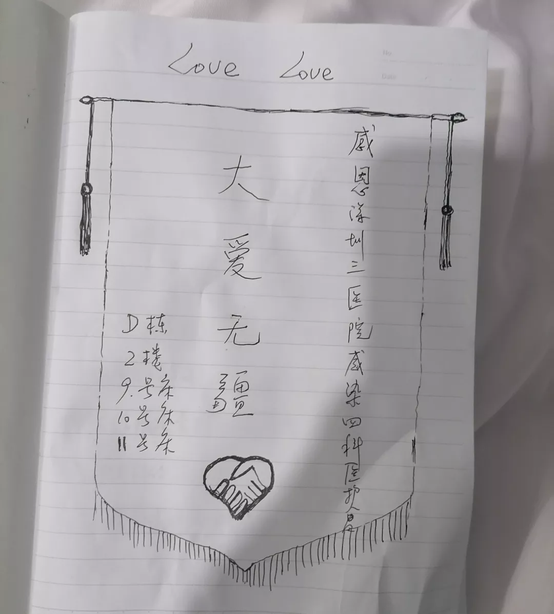 2月11日,深圳市三醫院兒科護士們收到了一個用好麗友餅干盒制作的手工賀卡,上面寫著“送給鐘護士和你們!謝謝你們”,賀卡上還畫了一張笑臉和四個心形。