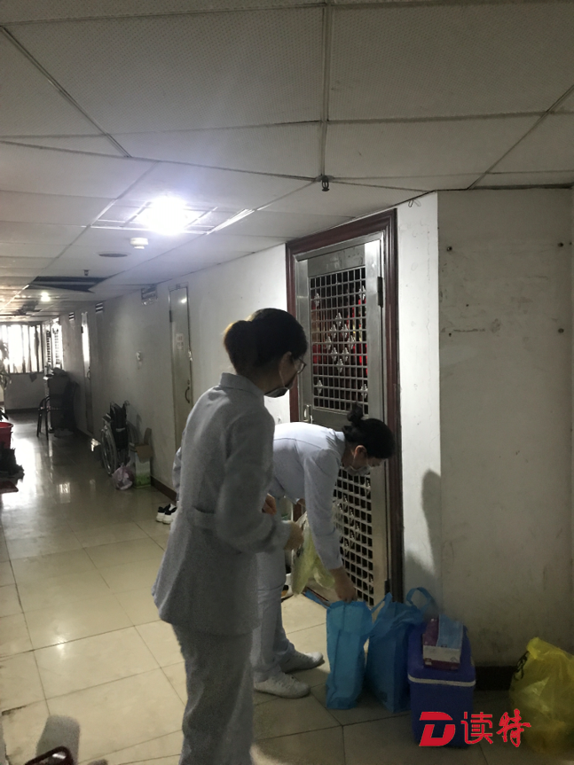 孫女士打開門,將工作人員遞進去的防護裝備穿戴完畢。“為了保護醫護人員的安全,減少交叉感染的可能性,所有的上門檢測都會在樓道里進行。”社康中心工作人員說。提前穿好防隔服等防護裝備、拿檢測時給居民坐的凳子、為凳子消毒,開始進行檢測前就需要做很細致的準備工作。