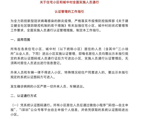2月9日,深圳發布《關于住宅小區和城中村全面實施人員通行認證管理的工作指引》,文中明確表示所有在各類住宅小區、城中村居住的人員需通過微信小程序“深i您”、“i深圳”公眾號等平臺自主申報個人信息,并依憑獲取健康碼進出小區,無須再做登記。