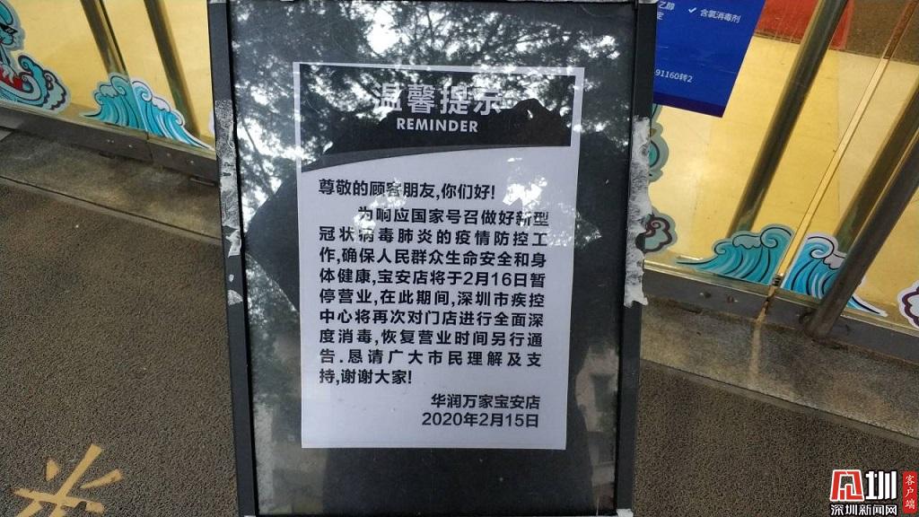 見圳客戶端·深圳新聞網2020年2月16日訊(見圳客戶端、深圳新聞網記者 陳婕 呂敏)根據疾控部門通報,寶安區新安街道五區華潤萬家商場三樓福浪多老年裝柜臺一員工,于2020年2月14日被確診為新型冠狀病毒肺炎患者。16日,華潤萬家寶安店暫停營業,記者通過華潤萬家深圳營運區域總經理兼寶安區沙井店店長李洪舟獲悉,該員工目前在深圳市第三人民醫院接受治療;2月10日該員工上班時佩戴了口罩,當天沒有接觸顧客,接觸的6名同事已隔離,目前情況良好,未出現發燒癥狀。在此期間,深圳市疾控中心將再次對門店進行全面深度消毒,恢復營業時間將另行通知。