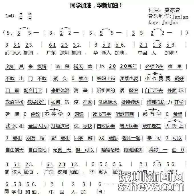 開學首日,深圳市福田區華新小學音樂教師黃家音作詞作曲《同學加油華新加油》祝福武漢,叮囑同學。
