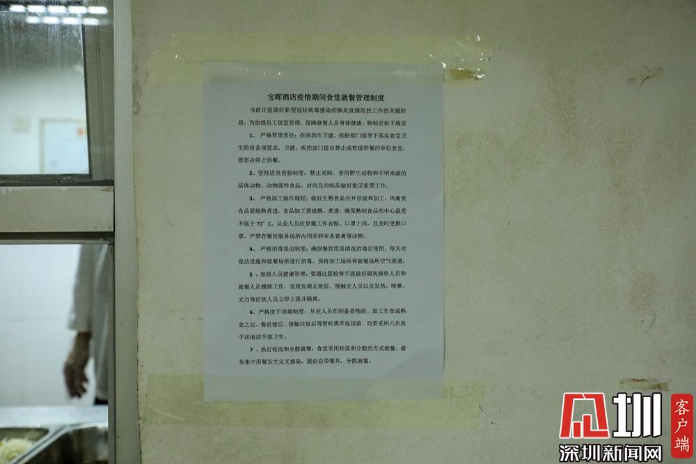 和大部分酒店選擇關閉餐廳不同,寶暉酒店員工食堂仍然開放,但是制定了嚴格的就餐制度,實行分時段就餐、由廚師統一打飯菜、按統一朝向間隔就坐等規定。