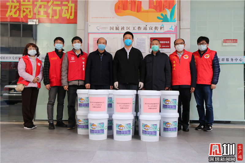 深圳市人大代表、廣東吉明玻璃工程有限公司總經(jīng)理吳冰向國(guó)展社區(qū)工作站熱心捐贈(zèng)消毒液等物資。