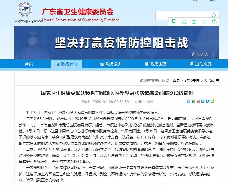 1月19日,國家衛生健康委確認廣東省首例輸入性新型冠狀病毒感染的肺炎確診病例。