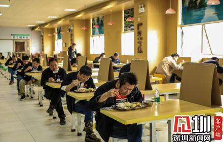 餐廳已經見不到過去熱鬧的場景,員工們都按照地上間隔1米的“黃格子”保持著安全距離,全程沒有太多的交流。餐桌也被用擋板進行隔離,一人一桌,同向就坐,就餐完畢還有餐廳員工對桌面進行消殺。