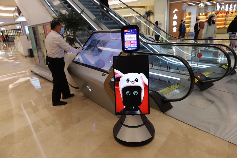 走在商場中,隨時可以看到保潔人員在消毒清潔。在商場一樓中庭導購屏和導購機器人處,保潔人員用消毒水反復擦拭屏幕。據悉,商場每小時巡回對扶梯、電梯、衛生間、消防通道、導視屏、扶手欄桿、休閑椅、門把手、垃圾房、垃圾桶等地進行消毒。