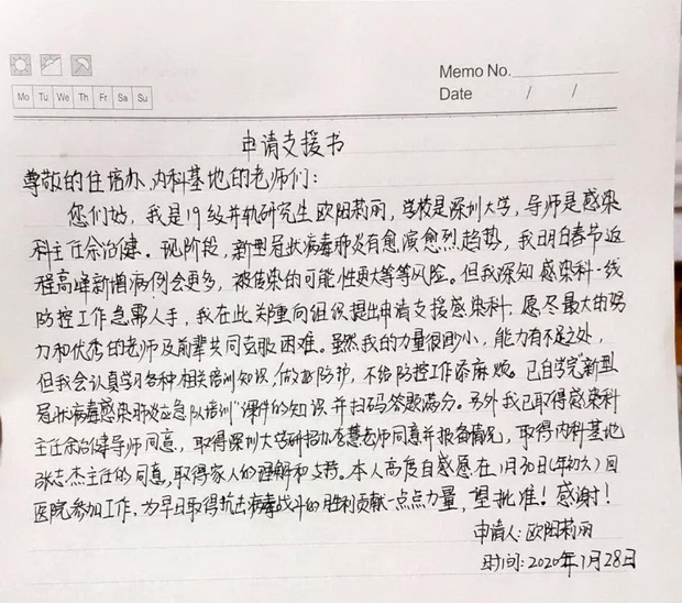 歐陽(yáng)莉麗同學(xué)申請(qǐng)支援感染科一線(xiàn)的申請(qǐng)書(shū)
